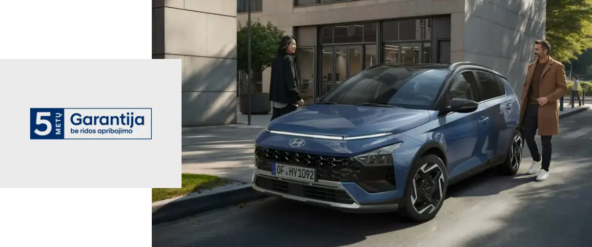 Kaip ir kiekvienas „Hyundai“ automobilis, „BAYON Cross“ gaminamas pagal aukščiausius kokybės standartus. Šią kokybę garantuojame suteikdami 5 metų neribotos ridos garantiją, kad galėtumėte užsiimti mėgstamais dalykais, nesijaudindami dėl savo automobilio.