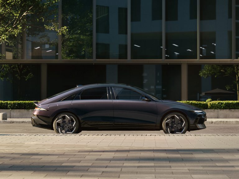 Naujojo IONIQ 6 nuožulnus variklio dangtis, ištęstas siluetas su pažemintu priekiu kuria elegantišką aptakų profilį. Juodos apdailos juostos kėbulo apačioje ir ant durų subtiliai pabrėžia IONIQ 6 aerodinaminę formą.
